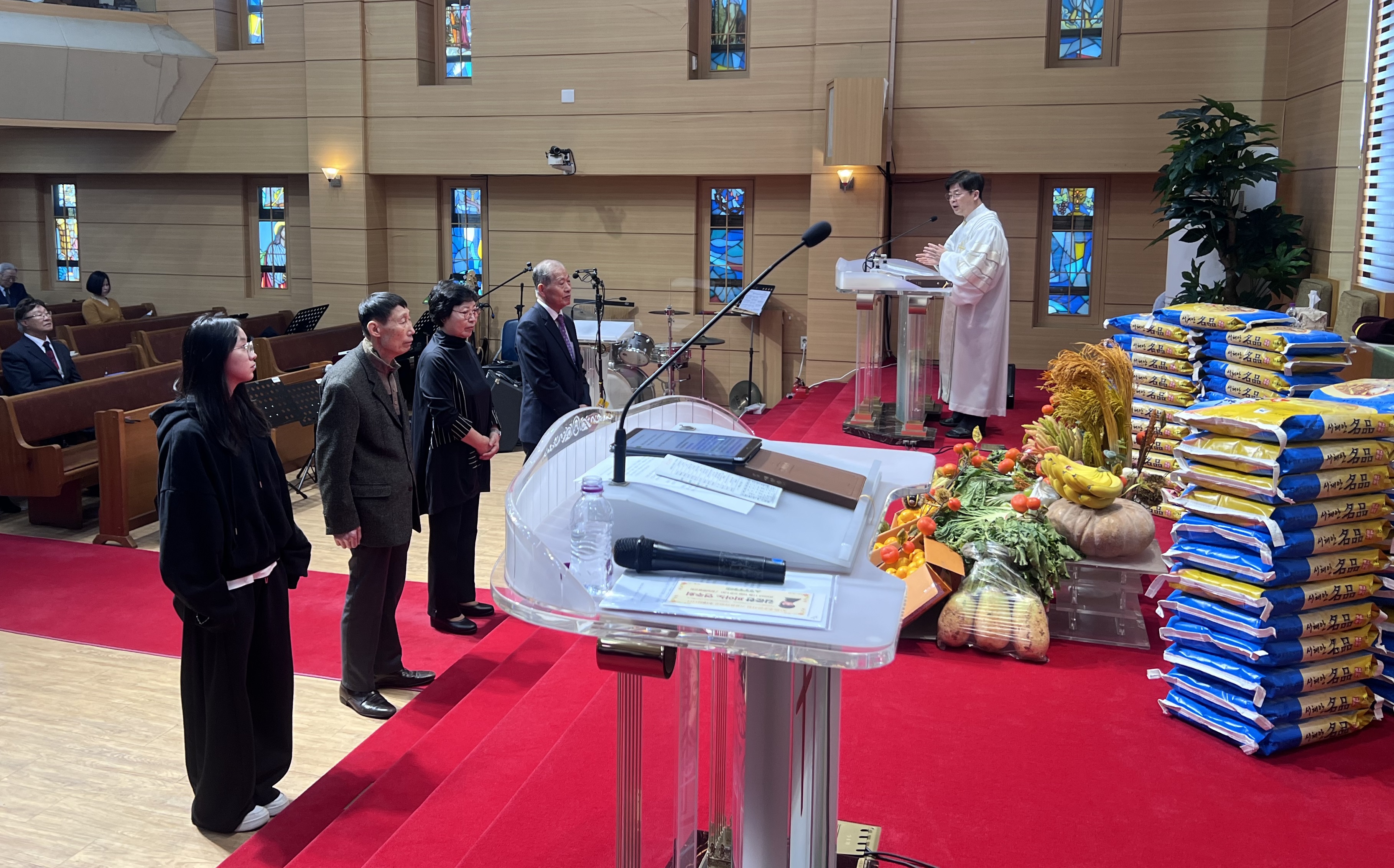 74명의 성도들의 헌신으로 강단에 쌀을 봉헌하여 이웃들과 풍성한 나눔을 할 수 있게 되었습니다.
