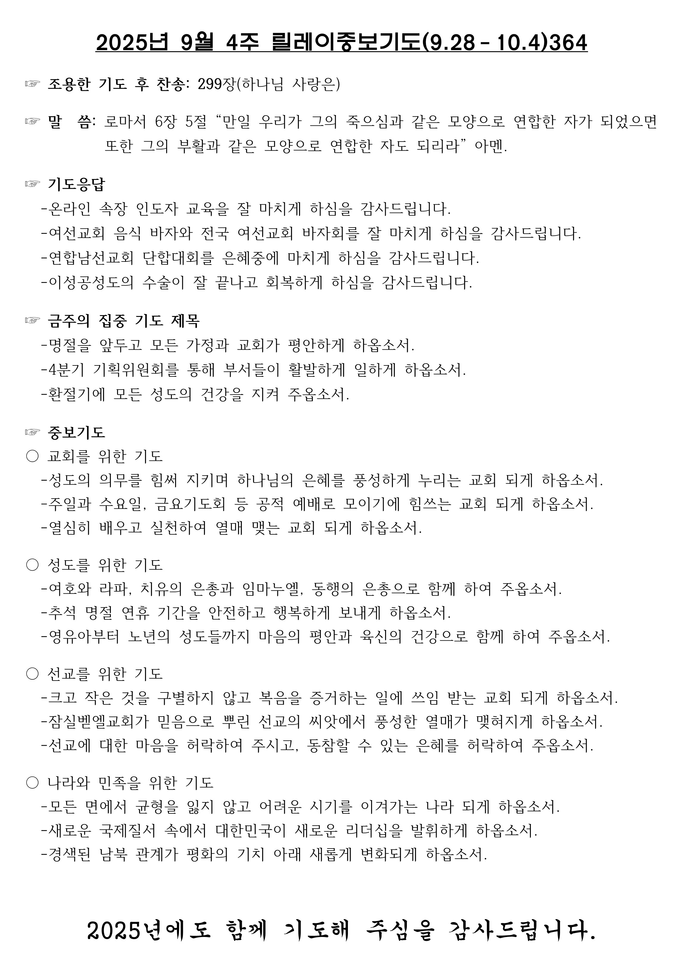 25년 9월 넷째주간 중보기도제목 [2025]