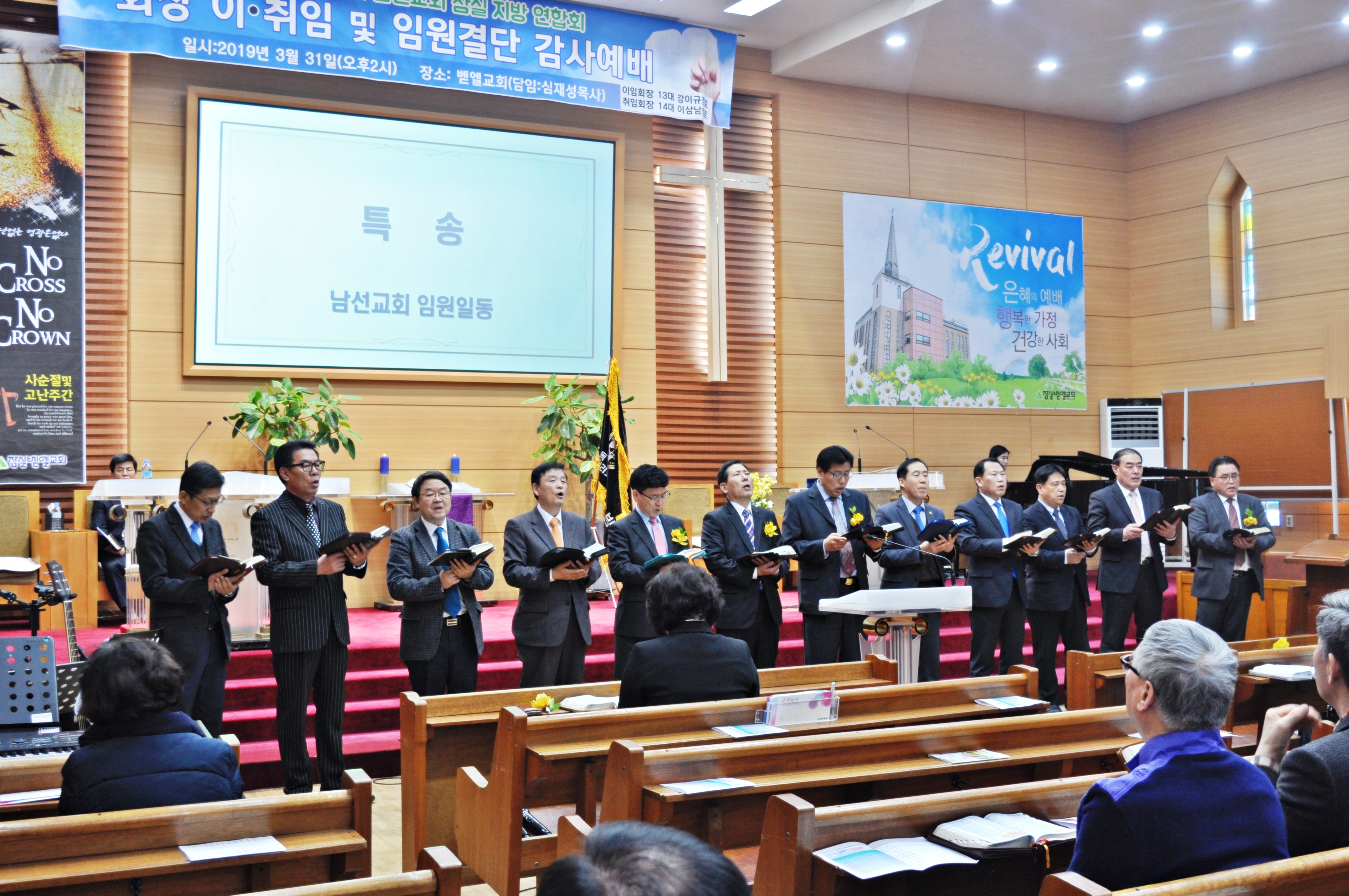 오늘 예배에서는 이삼남 장로님께서 잠실지방 남선교회회장으로 취임하는 자리였습니다.